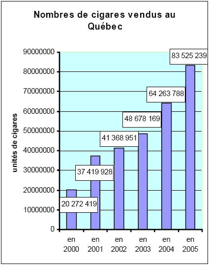 Montréal, mercredi le 18 octobre 2006 — Selon les récents chiffres obtenus de Santé Canada, il y a eu au Québec, au cours des cinq dernières années, une explosion des ventes de cigares. La quantité de cigares et cigarillos vendus au Québec aurait augmenté de plus de 300% entre 2000 et 2005. [Toutes les données s’appliquent à la catégorie « cigares », qui inclut les cigarillos. Il n’existe pas de données distinctes pour les cigarillos.]
